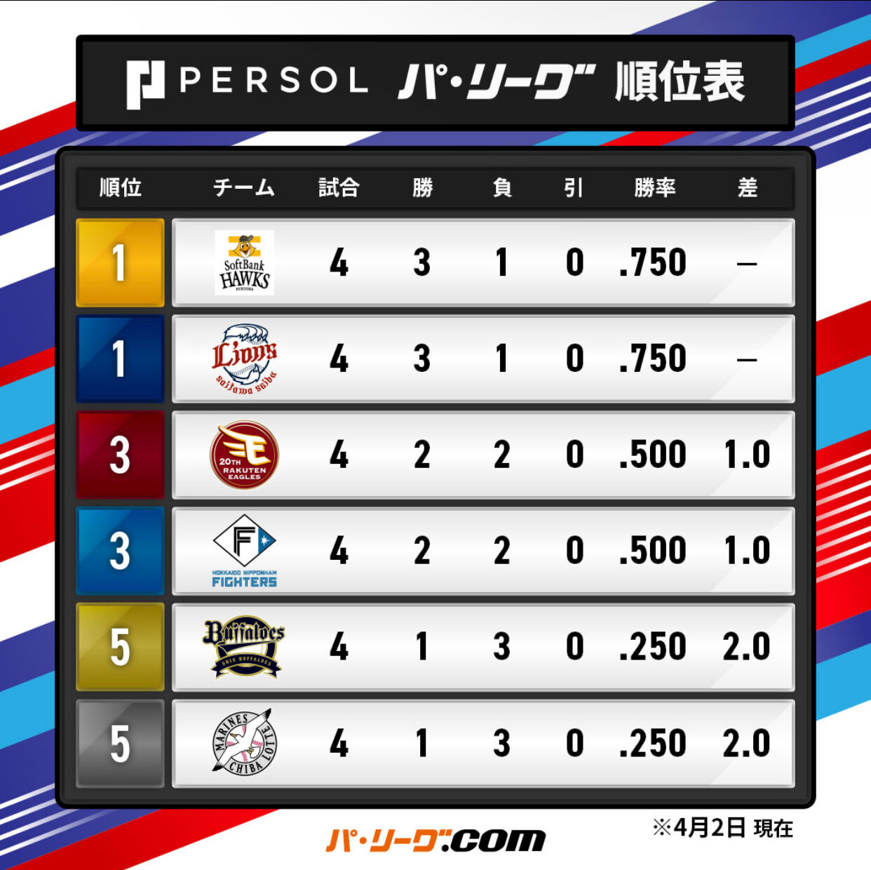パーソル パ・リーグ 順位表 (4/2)⚾️