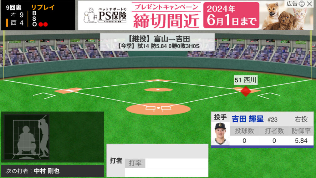 356: 西4-9オ(9回裏) 24/05/24(金) 21:36:31 ID:IXef