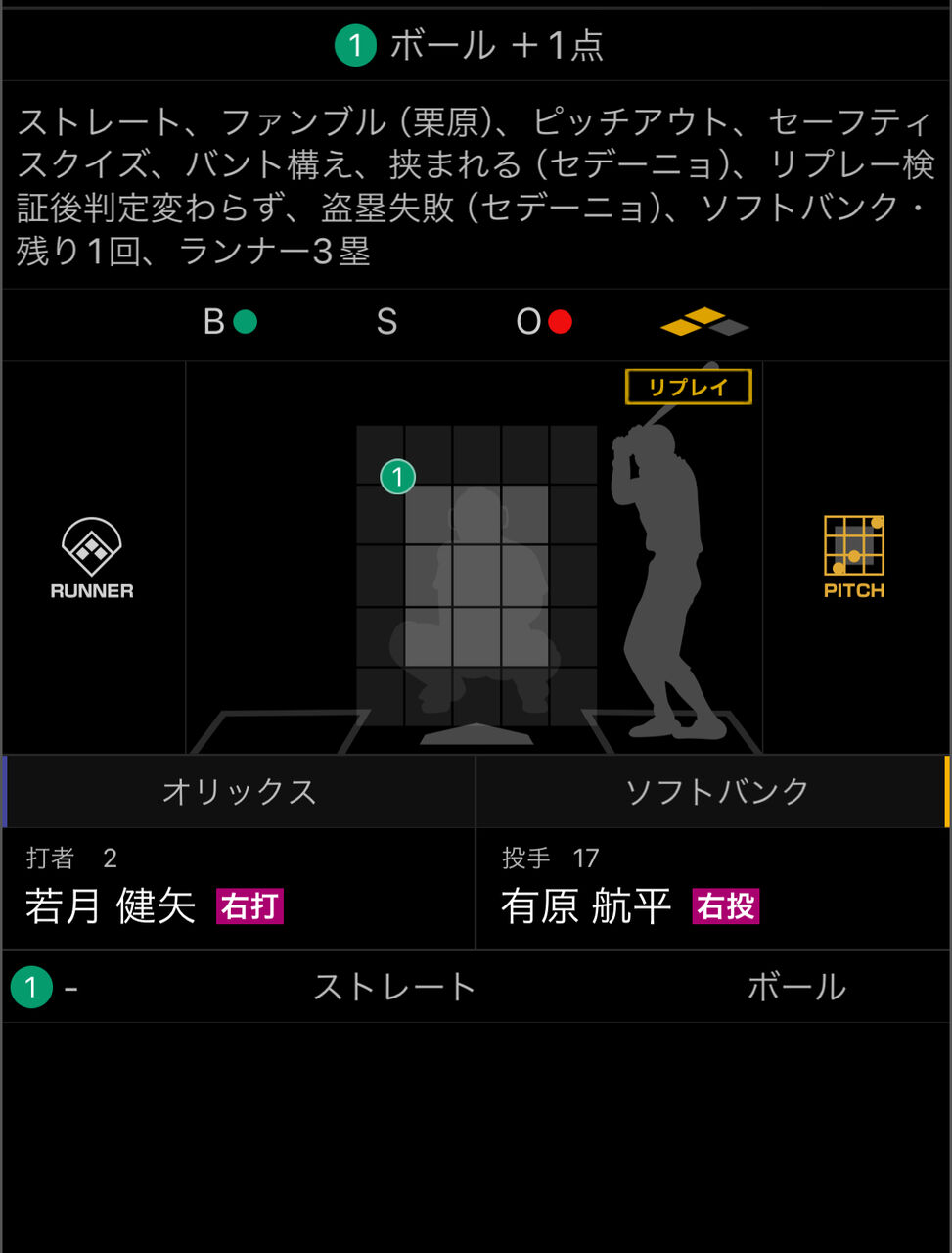 ストレート、捕球ミス(栗原)、スクイズ失敗、バント構 え、ピッチアウト、挟まれる(セデーニョ)、リプレー検証 後判定変わらず、盗塁失敗(セデーニョ)、ソフトバンク・ 残り1回、ランナー3塁