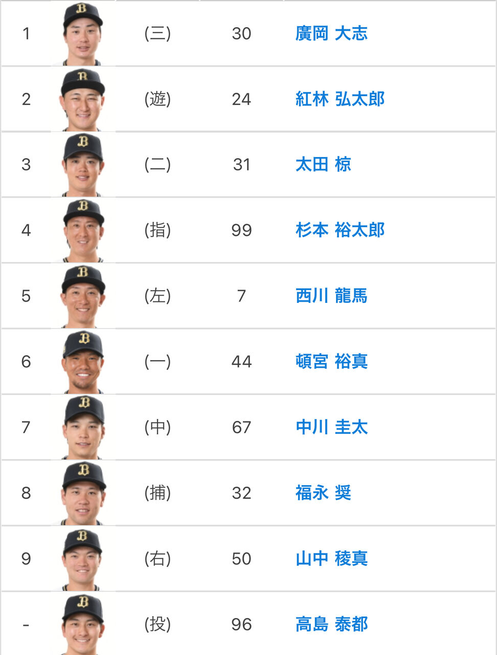 捕手が福永になって無敵が8番になったくらいで昨日とほぼ同じかな